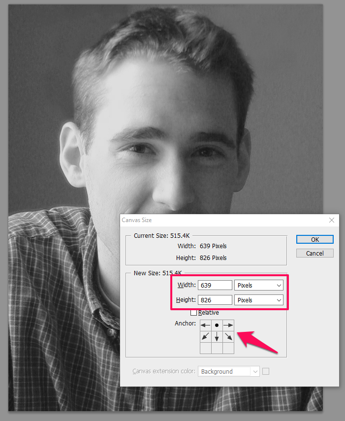 To crop your image in Photoshop select Image -> Canvas Size from the top menu (Adjustments -> Crop in Pixlr Express or Right-Click -> Image -> Canvas Size in Gimp). Change the measuring unit to Pixels and change the height to 400. Since we know we want to keep the top of the image where the woman's head is, select the top-center square as the anchor. Press OK. A warning will pop up telling you that the new canvas size is smaller than the previous one, and that clipping will occur. Click on Proceed.