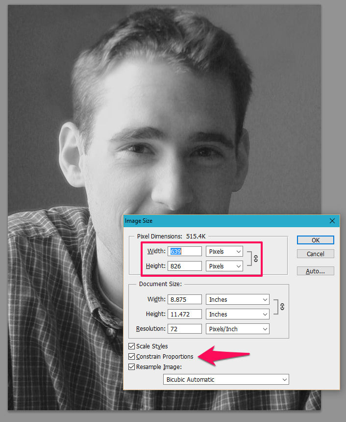 If we change our height to 400 we'll only have 267 for our width, so instead let's change our width to 400. In Photoshop you would select Image -> Image Size from the top menu (Adjustments -> Resize in Pixlr Express, Right-Click -> Image -> Scale Image in Gimp). Make sure Constrain Proportions is checked, then enter 400 as your width. Press OK.