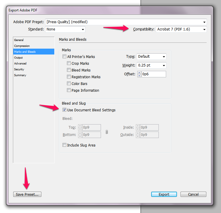 When the dialog window pops up choose the location where you want to save your file. Now the fun begins. When the Export Adobe PDF dialog box pops up, the Adobe PDF Preset should say [Press Quality]. If it does not, press cancel and try again. The press quality preset will default to a Compatibility of Acrobat 5, but you can safely change this to Acrobat 7 (Acrobat 11 is the newest, and Acrobat 7 was released in 2009, so it should be safe). Next, navigate to the Marks and Bleeds tab and check the Use Document Bleed and Settings checkbox under the Bleed and Slug heading. Finally, click the Save Preset button to save these settings for later. Use a name that is easy for you to remember. Your custom setting will now appear in the Adobe PDF Presets menu in InDesign.