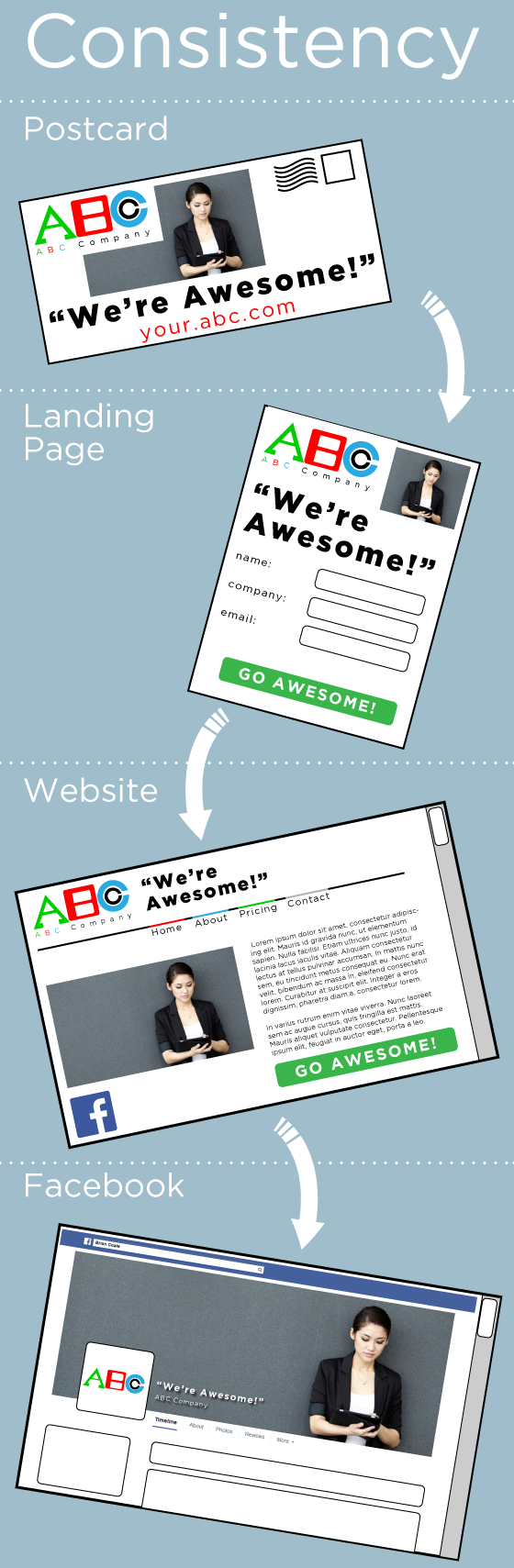 - Similarly, when sending direct mail campaigns, the imagery used on the postcard should look like the imagery used on the landing page.