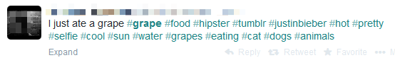 Look again at the tweet in Tip #4: "I just ate a grape." What does that have to do with #hipster, #tumblr, #justinbieber, #hot, #pretty, #selfie, #cool, #sun, #water, #cat, #dogs or #animals? As bad as this tweet is, it's made far worse by lumping in hashtags that have nothing to do with the post itself. The goal of a hashtag is to help someone who is interested in the topic you are discussing to find your post. If I'm searching for posts about #animals, I probably don't expect to find people talking about eating grapes. So remember to keep it relevant!