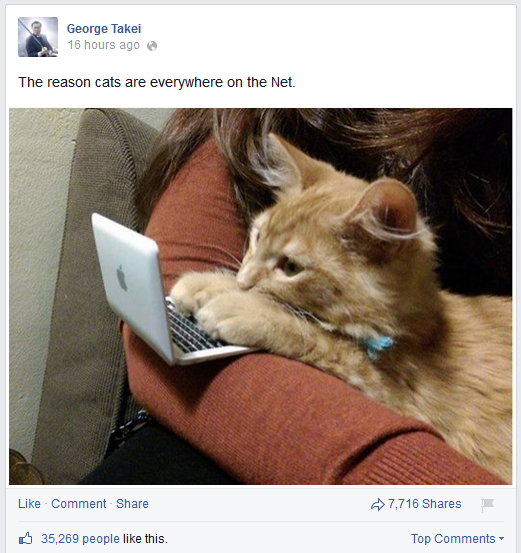 Take George Takei for example, most people on Facebook don't even think of Mr. Takei as a brand, when in reality he is a shining example of how a brand can succeed in generating both affinity and propensity on Facebook. The purpose of Mr. Takei's Facebook page is to, among other things, sell his books and promote his acting career, but rarely does he directly sell anything on Facebook. Instead, he might pepper references taken from the pages of his book (Oh Myyy) or tell stories about how much fun he's having with the Allegiance cast. The rest of the time, he's starting conversations, posting content gems, taking selfies and yes, sharing cat videos.