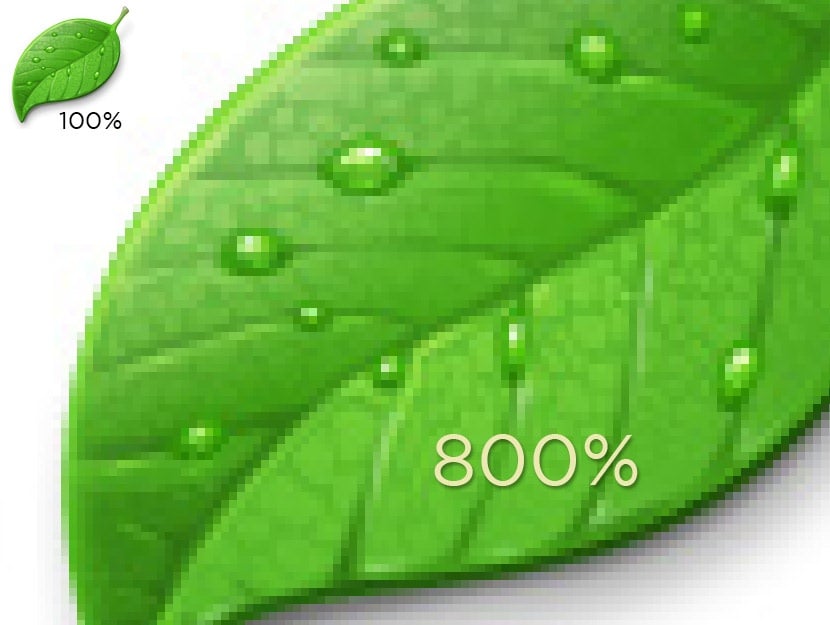 To see an example of this image degradation in action, click on the image of the leaves to see the leaf icon at 100%, then upscaled to 800%. Notice how the pixels become increasingly obvious as the image gets larger? This loss of apparent image quality is known as Pixelization.